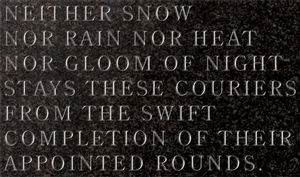 By the time Tony Mitchell picks up the 10001's at the James A. Farley Post Office in midtown — about sixty hours since it left Gold Hill — they've been refined even further, by local post office, carrier route, and delivery order. Outside, above majestic Corinthian columns, the building is inscribed with the most famous of postal quotations: "Neither snow nor rain nor heat nor gloom of night stays these couriers from the swift completion of their appointed rounds." During the blackout following hurricane Sandy, when New York City was paralyzed below Thirty-fourth Street, Morgan operated at 25 percent capacity by using a generator.